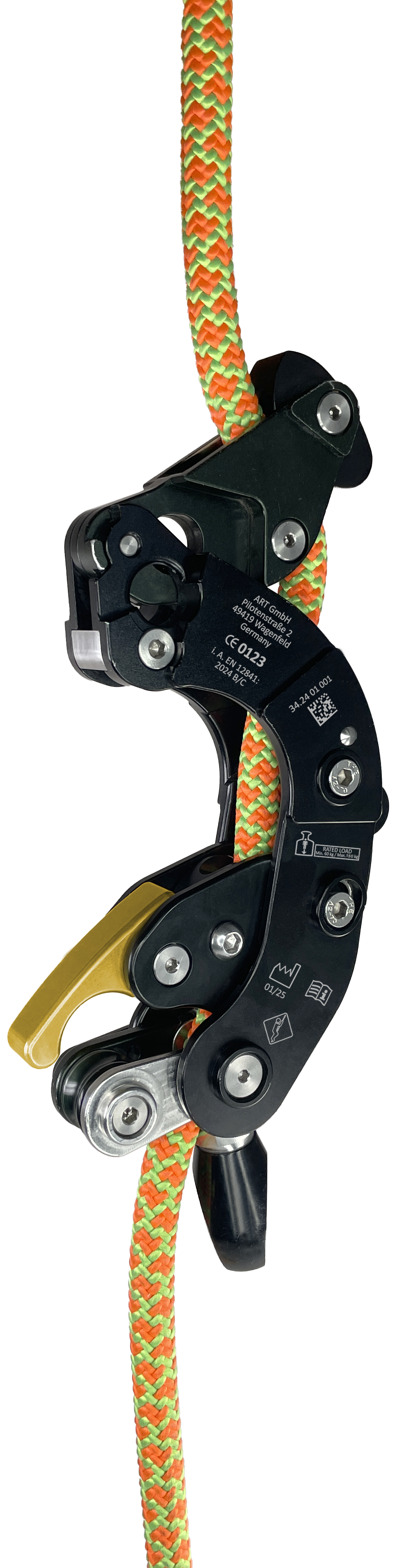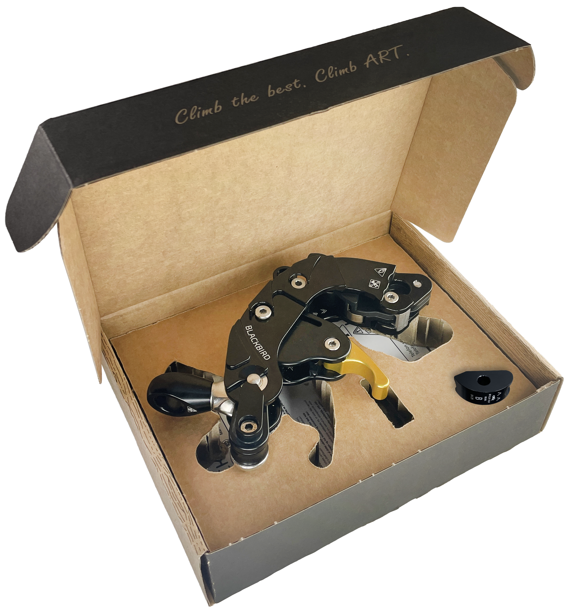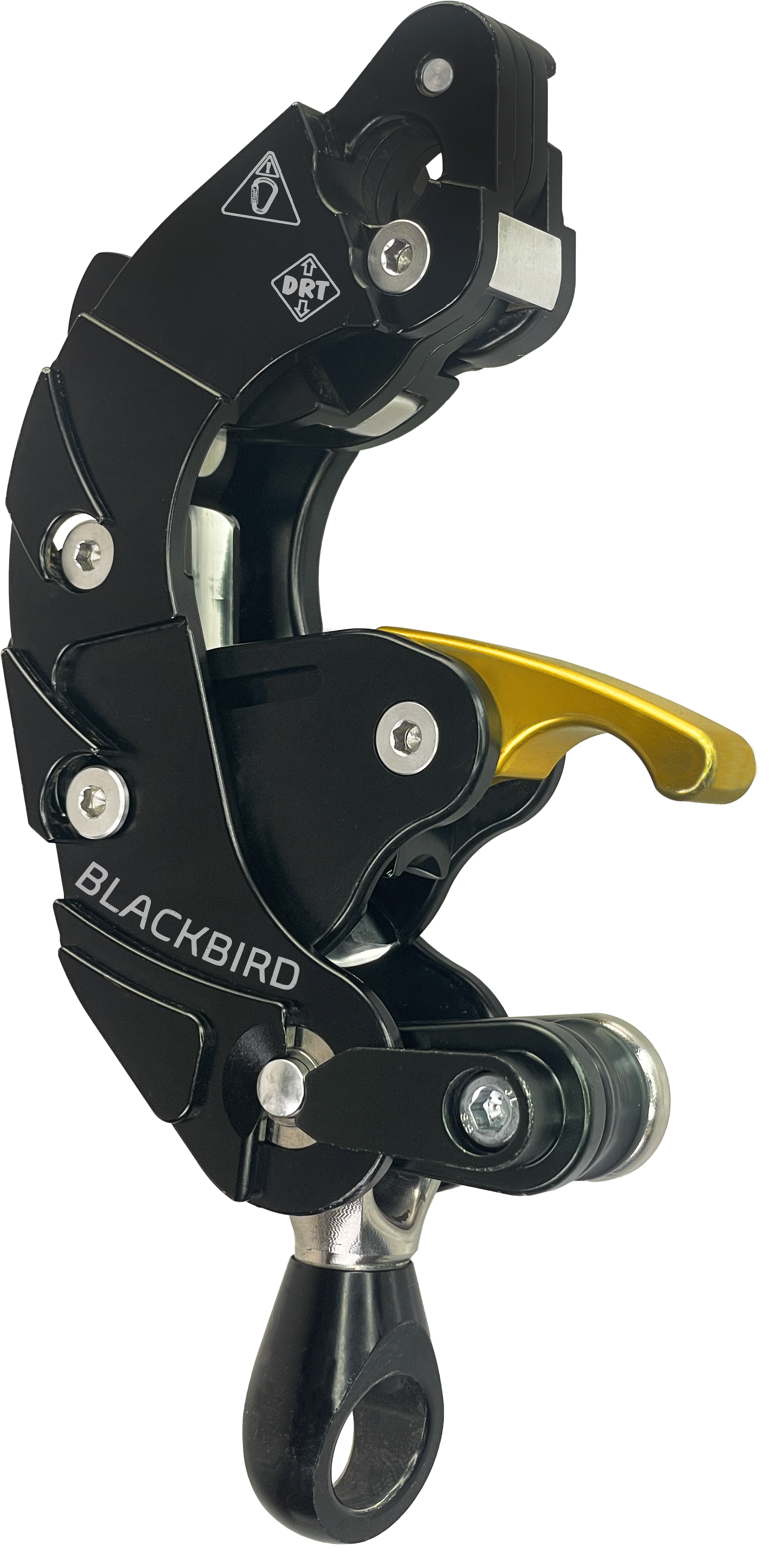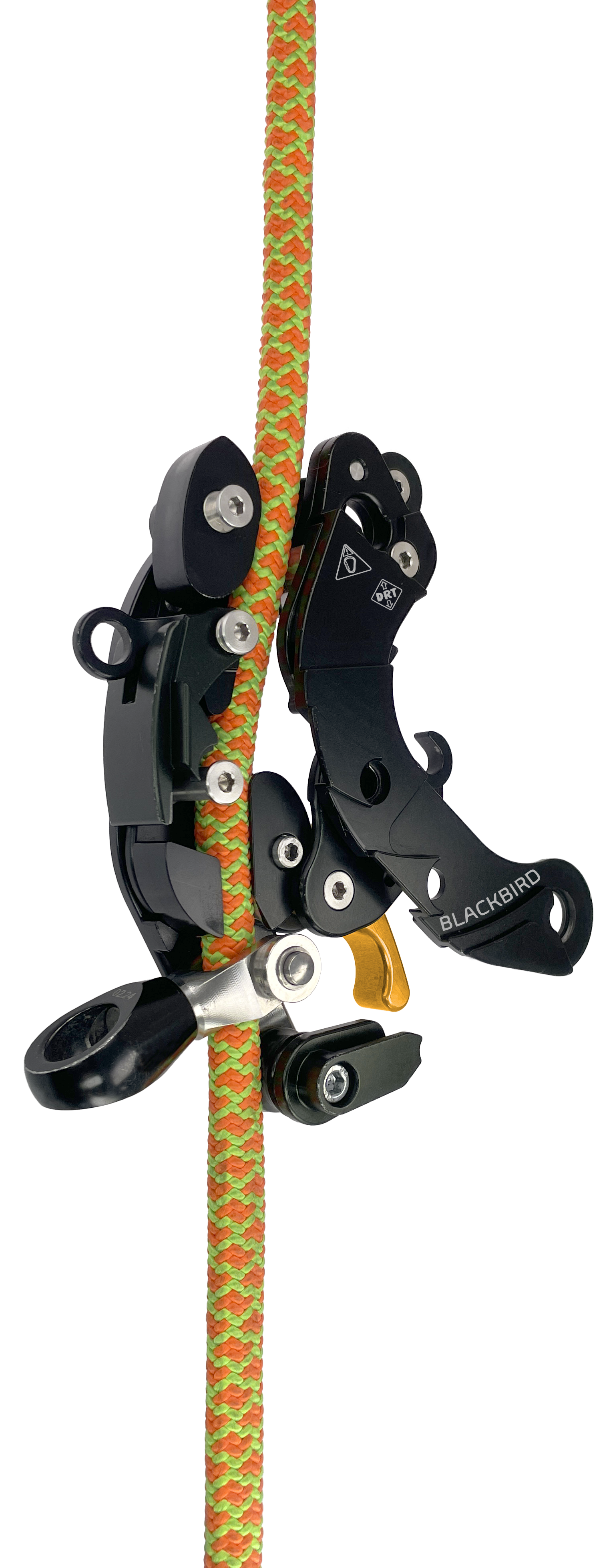 The BlackBird by ART has been designed to facilitate climbing both with a single rope system (SRS/SRT) and a moving rope system (MRS/DRT). Without additional adjustments or tools, it is possible to switch between both techniques. The rope does not need to be removed from the device for this. The construction allows for identical descent behaviour in SRT and MRS. The BlackBird can be fully opened with a push button and can be is mid-line attachable without the device needing to be detached from the harness.