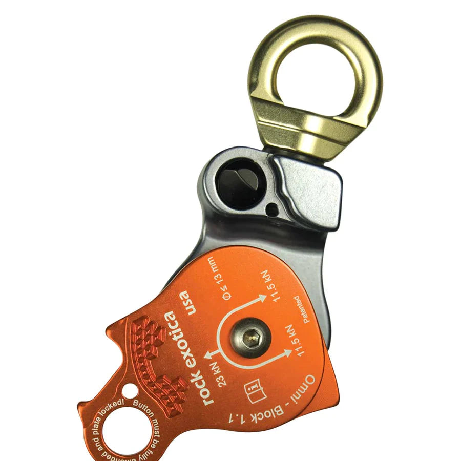 The Omni Block combines a swivel and pulley into one tool, and incorporates a unique side plate that opens while the pulley is still attached to the anchor. Traditionally, a pulley is connected to a swivel by a karabiner. However, the Omni eliminates the need for the karabiner, reducing length and pieces of equipment in the rigging system. The short length of the Omni is important when used in high-angle, confined space or other space-sensitive rigging environments. The reduced weight of the Omni will make hauling your gear easier. Additionally, the Omni side plate can be opened without detaching from the karabiner.